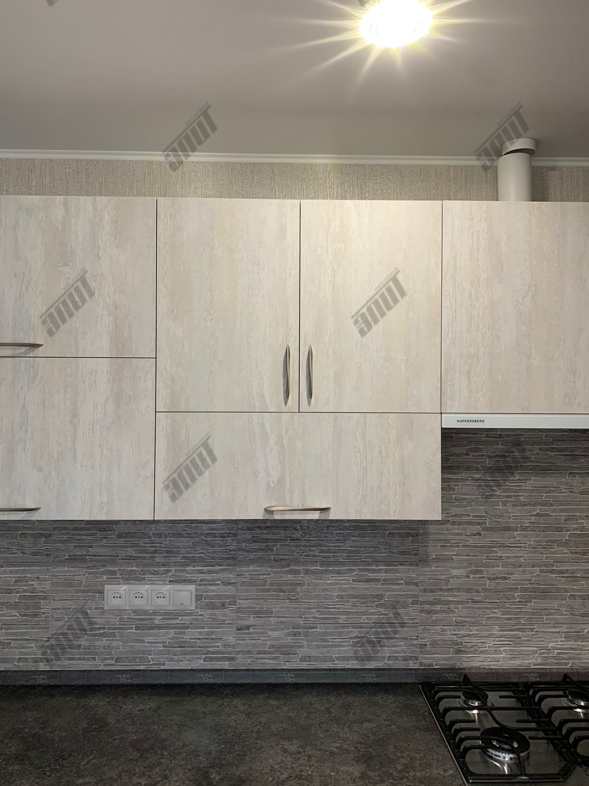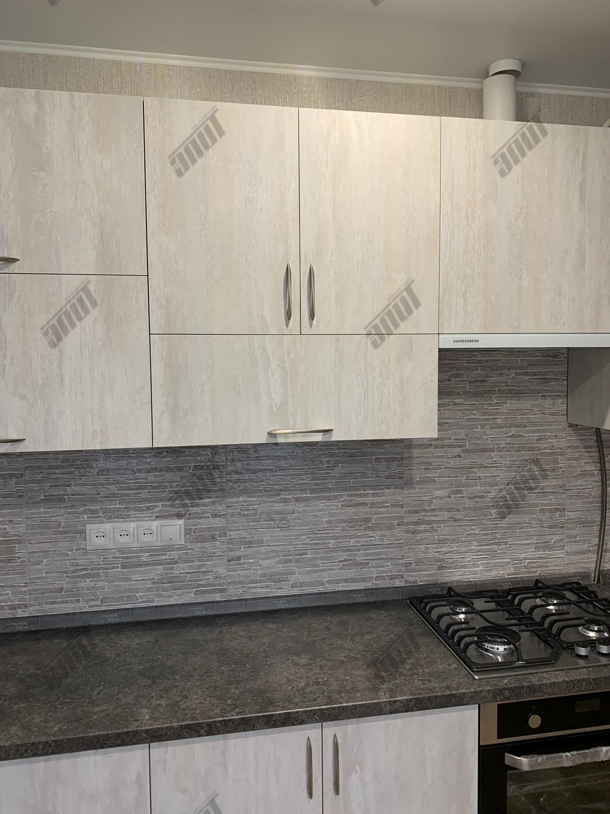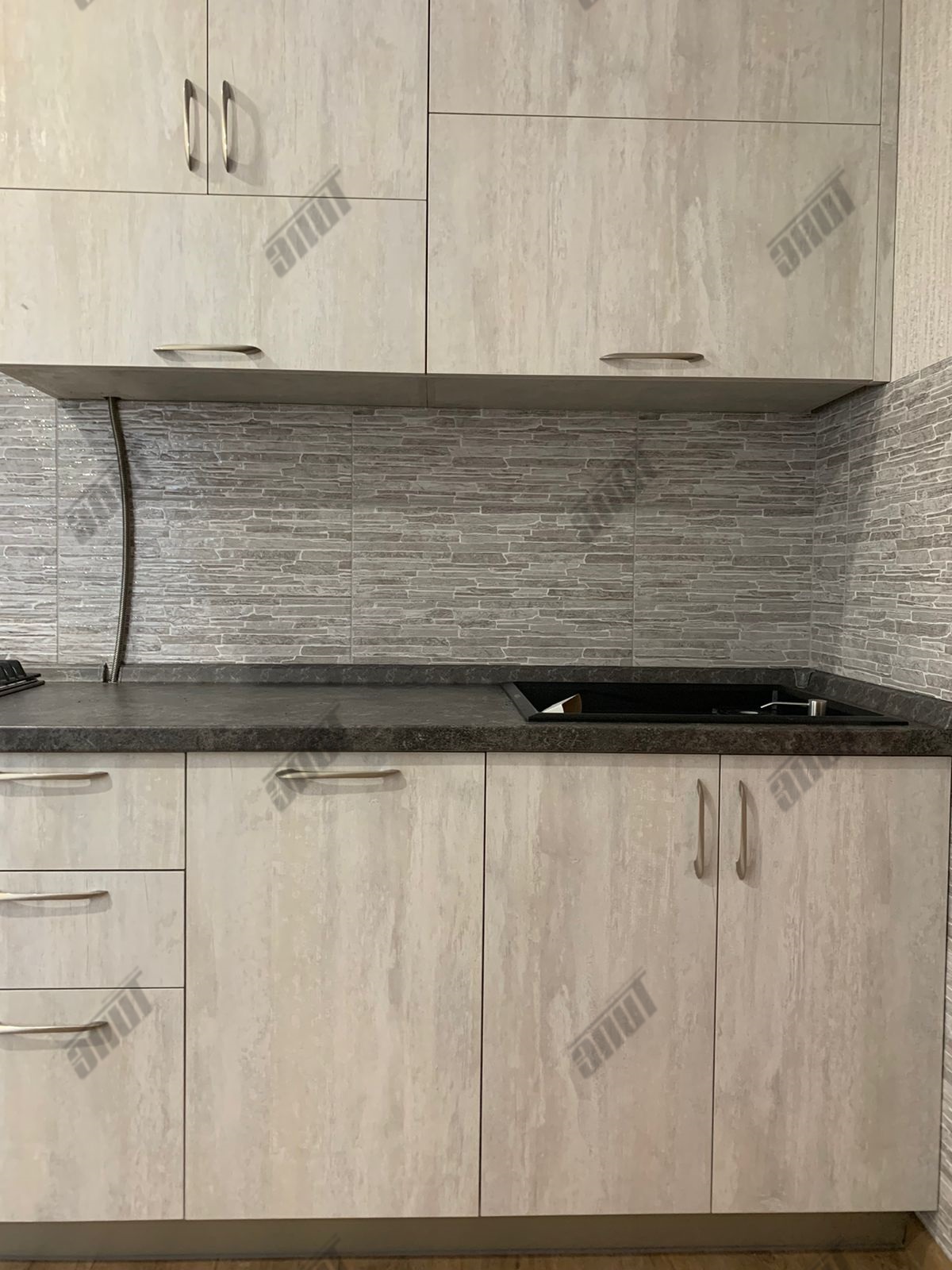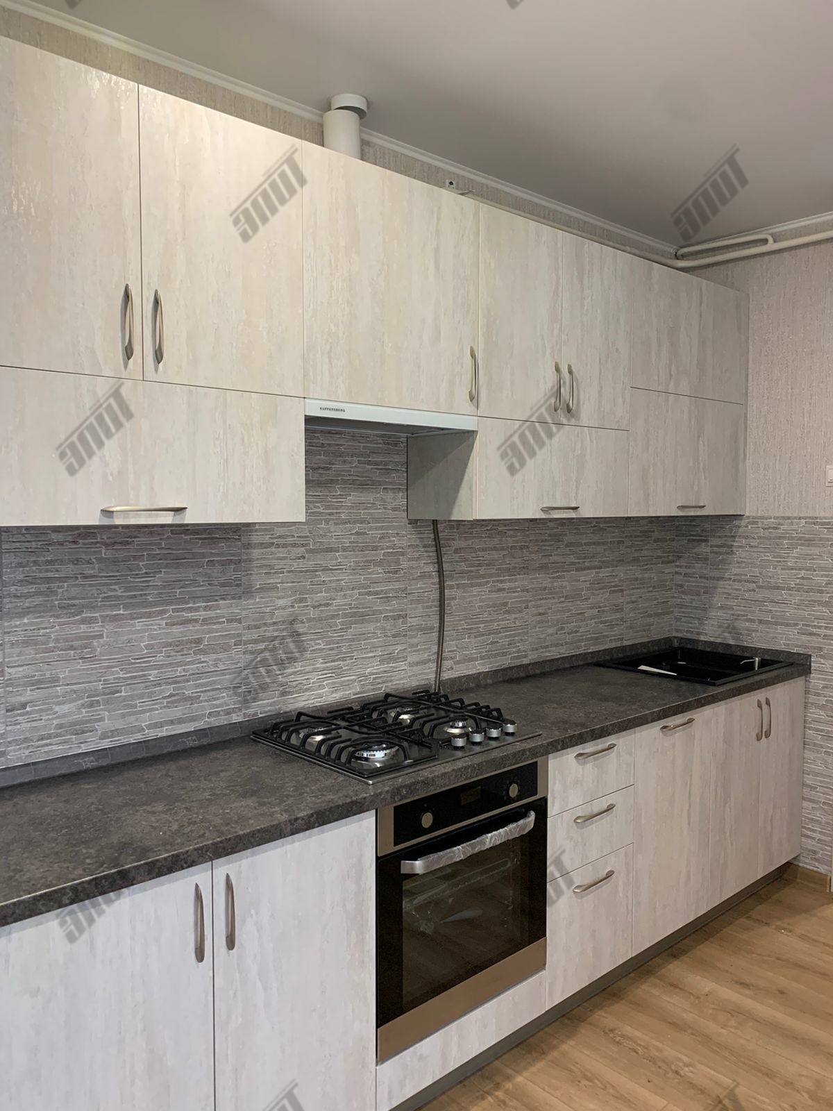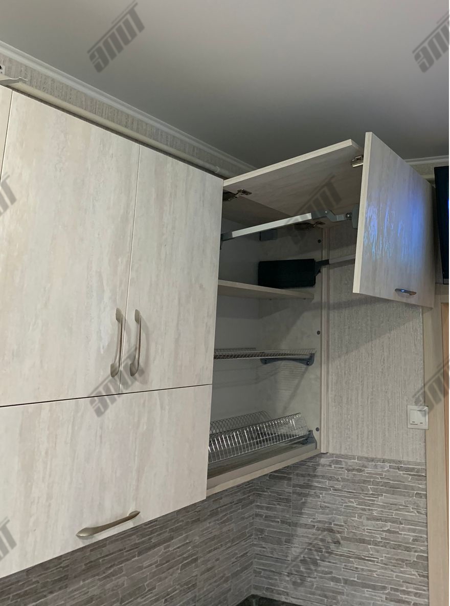 Корпус кухни изготовлен из... ламинированной древесно-стружечной плиты цвета Слейт. Лицевая и функциональная фурнитура от ведущих европейских производителей Hettich, FGV, Quadro, Indigo. Подъёмный механизм TOP-STAYS ST. Столешница повышенной влагостойкости (толщина 38 мм.) в цвете Трюфель антрацит. Ручки Boyard - никель.