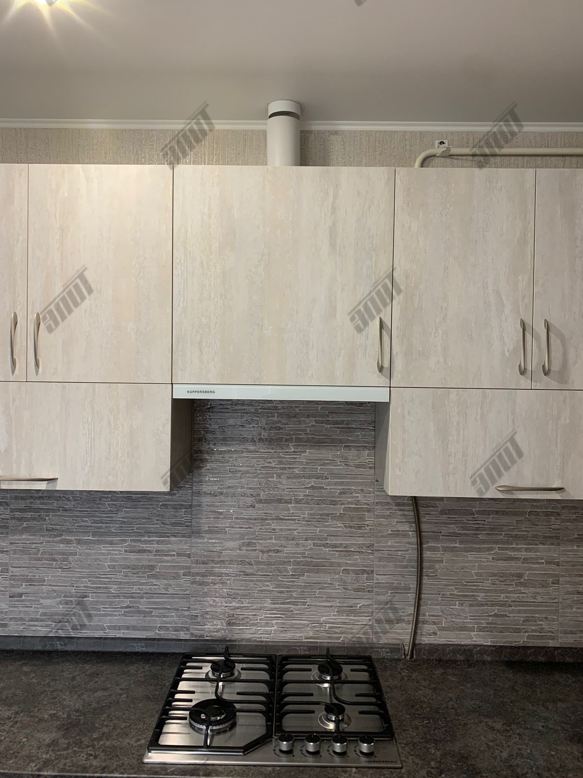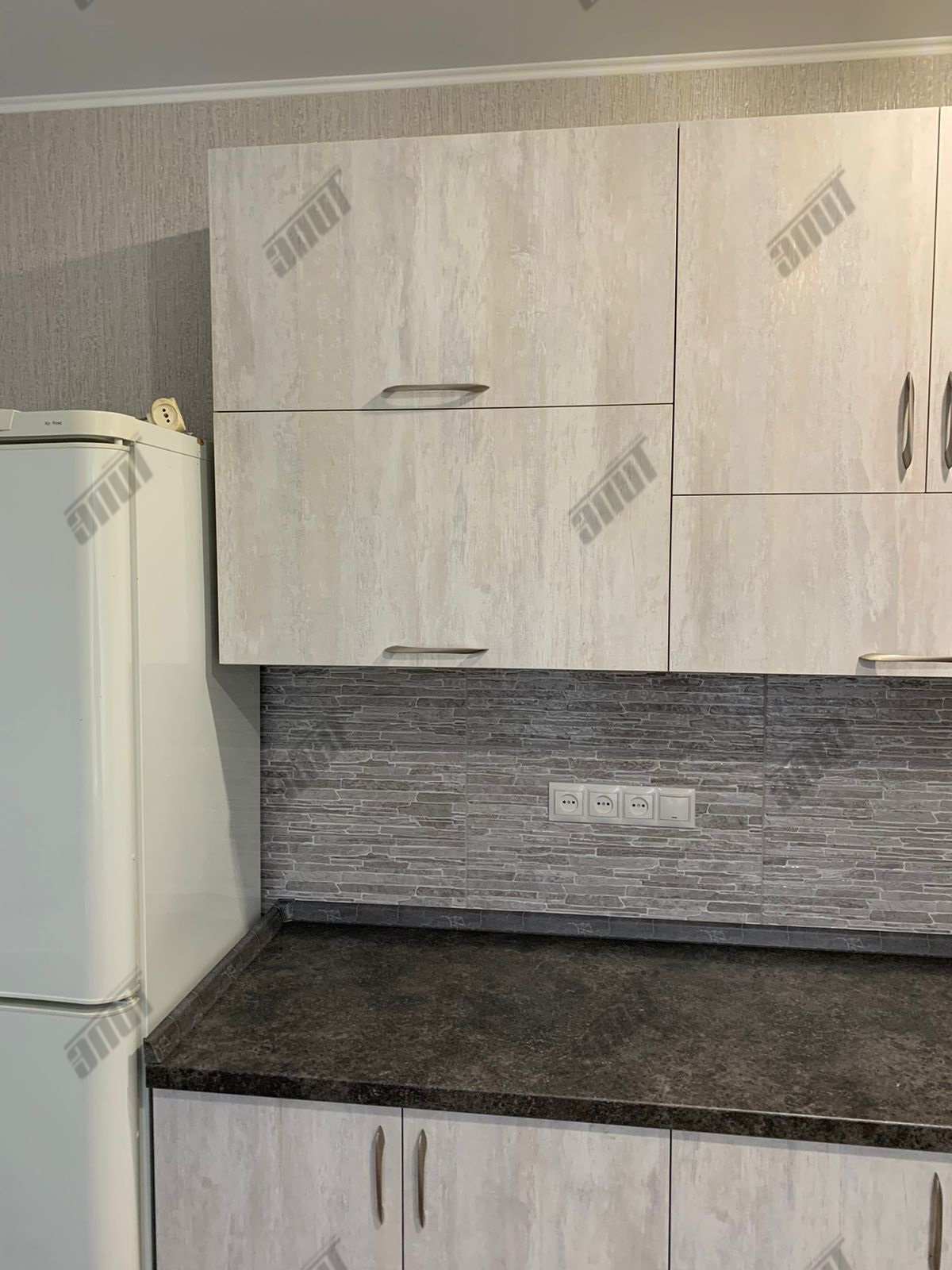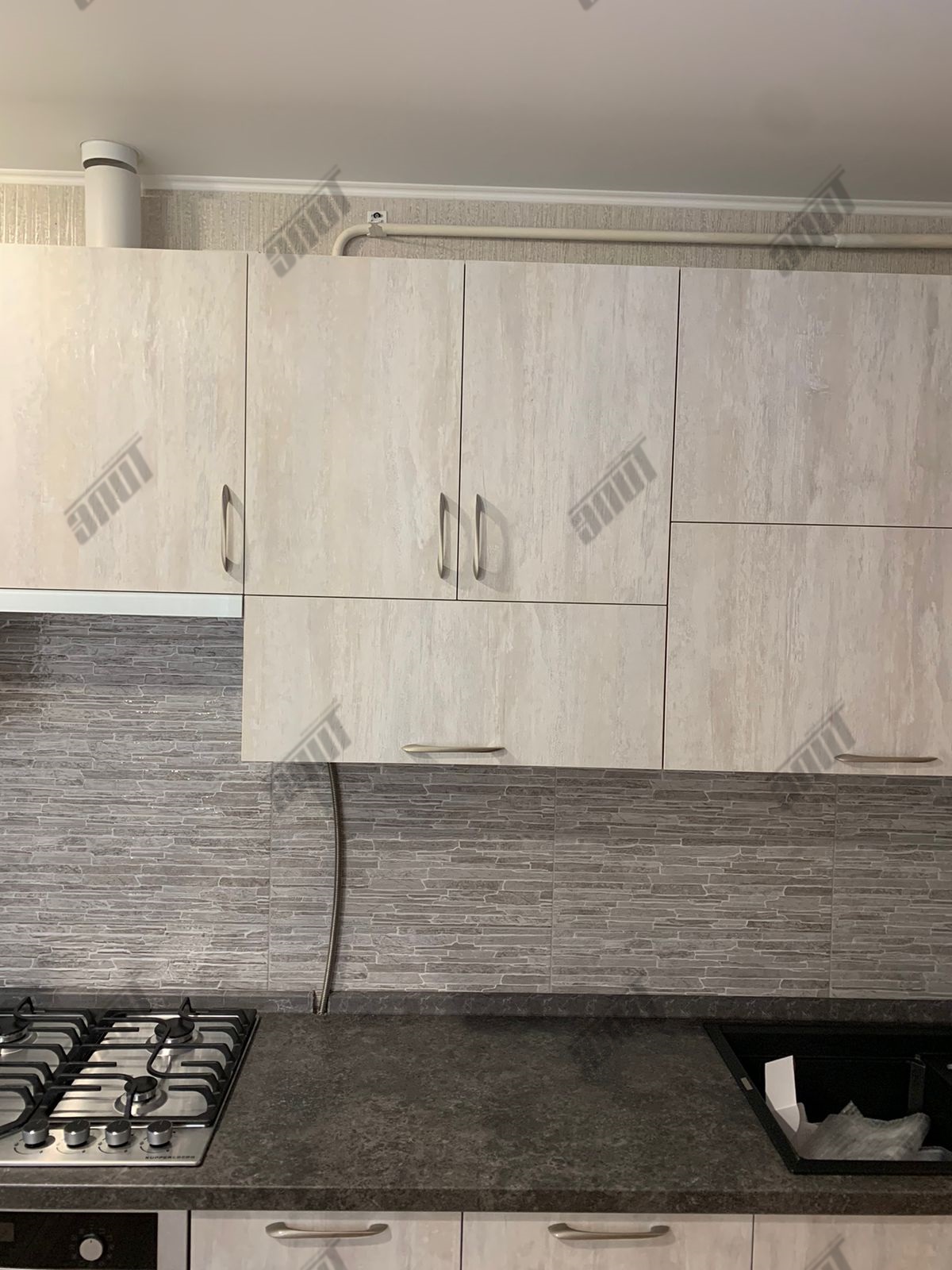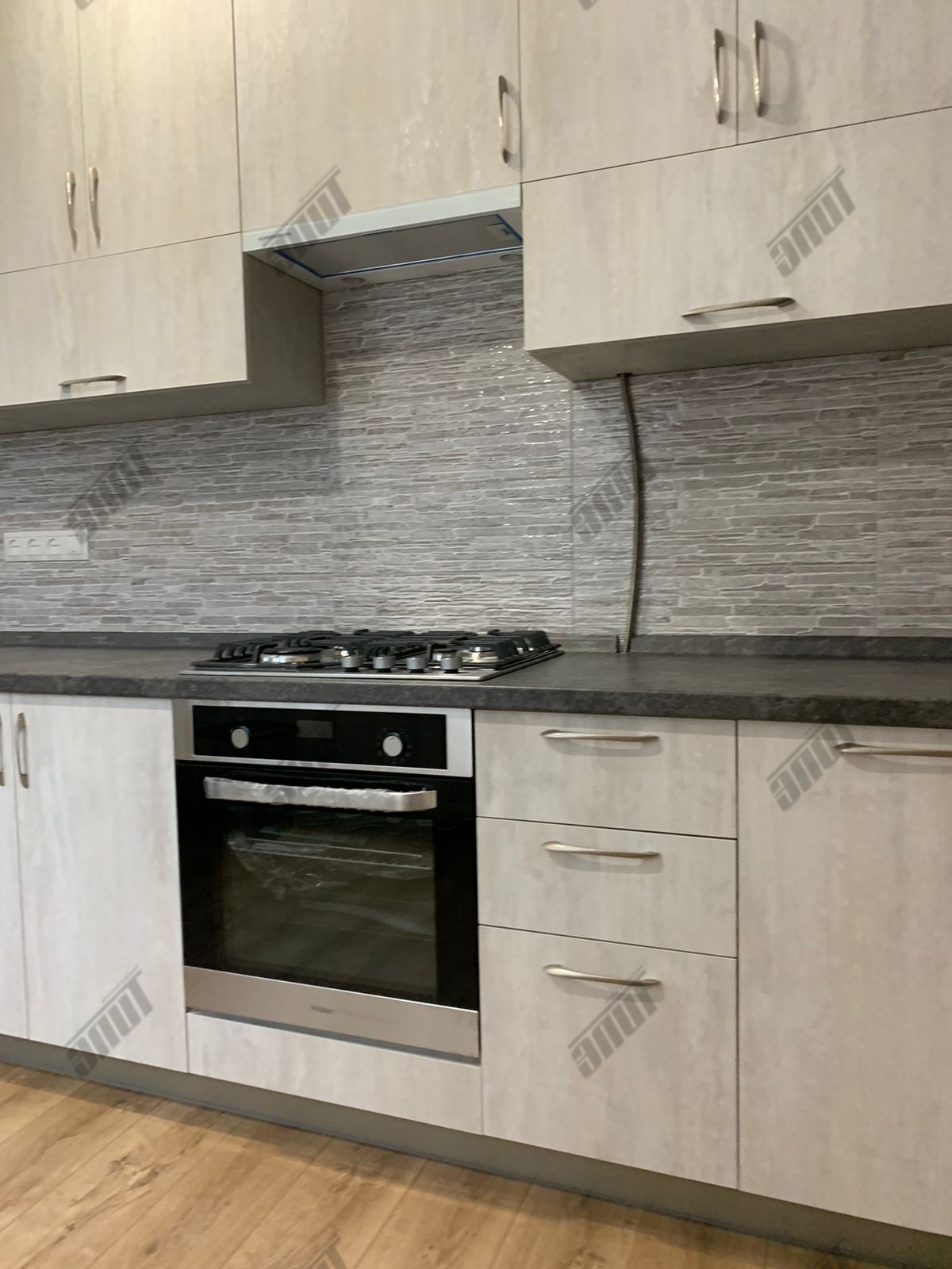 Корпус кухни изготовлен из... ламинированной древесно-стружечной плиты цвета Слейт. Лицевая и функциональная фурнитура от ведущих европейских производителей Hettich, FGV, Quadro, Indigo. Подъёмный механизм TOP-STAYS ST. Столешница повышенной влагостойкости (толщина 38 мм.) в цвете Трюфель антрацит. Ручки Boyard - никель.